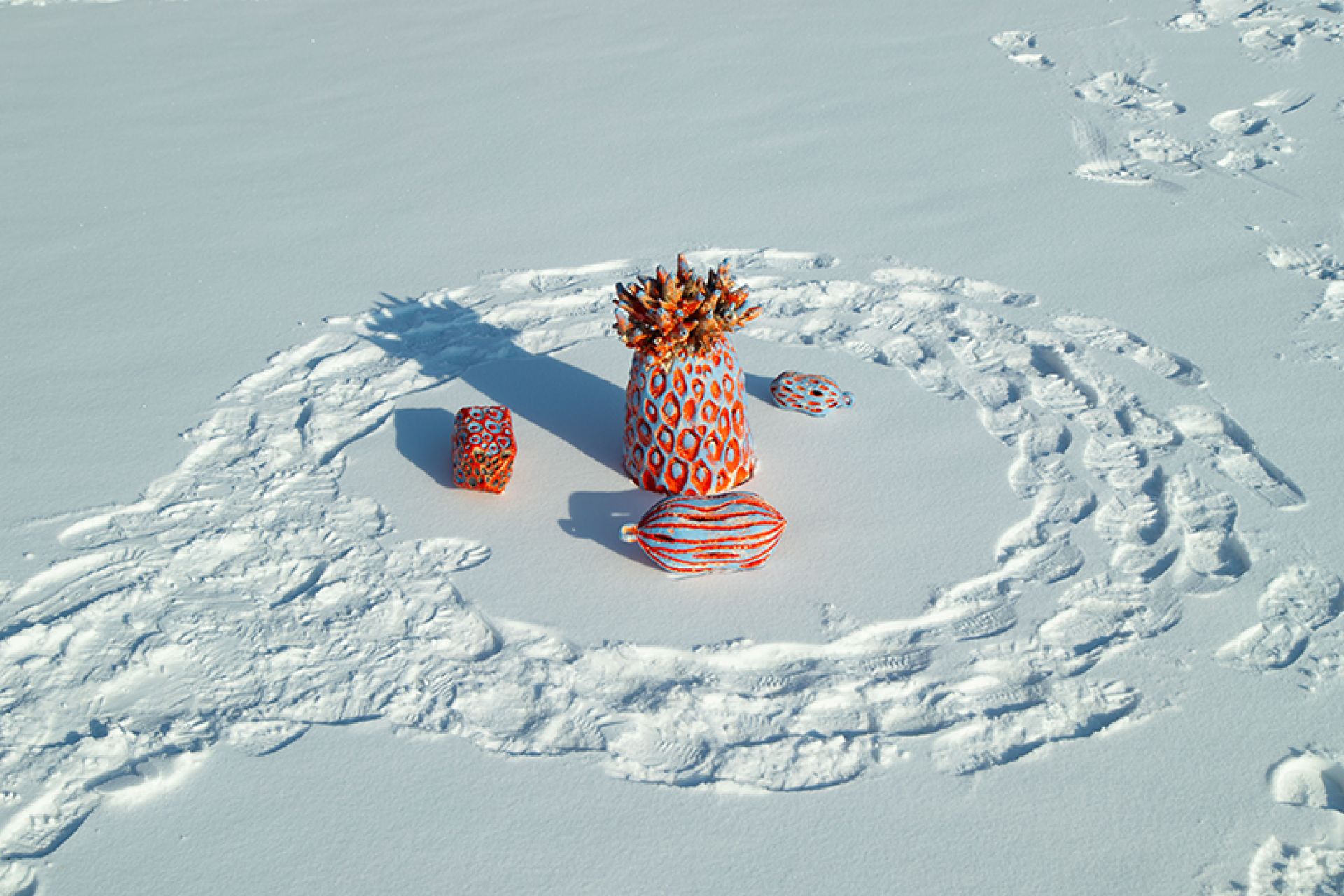 Нина Биланова, график, скульптор, керамист, живописец, посадила на льду огненный баобаб. В разных культурах это дерево, словно перевёрнутое вверх корнями, имеет разный, но очень интересный, а порой сакральный смысл: он хранитель рода, он символ путешествий и плодородия.