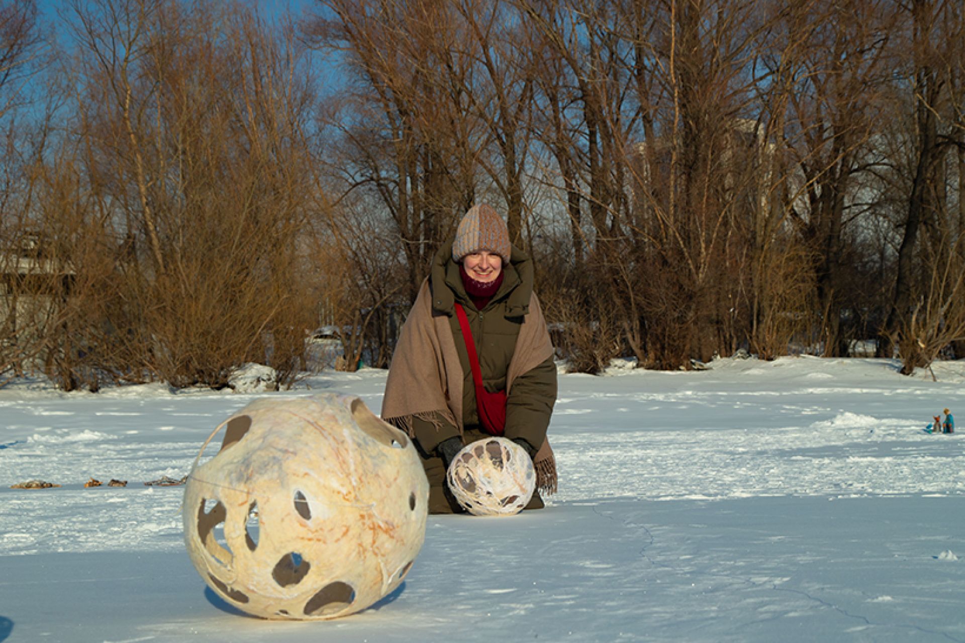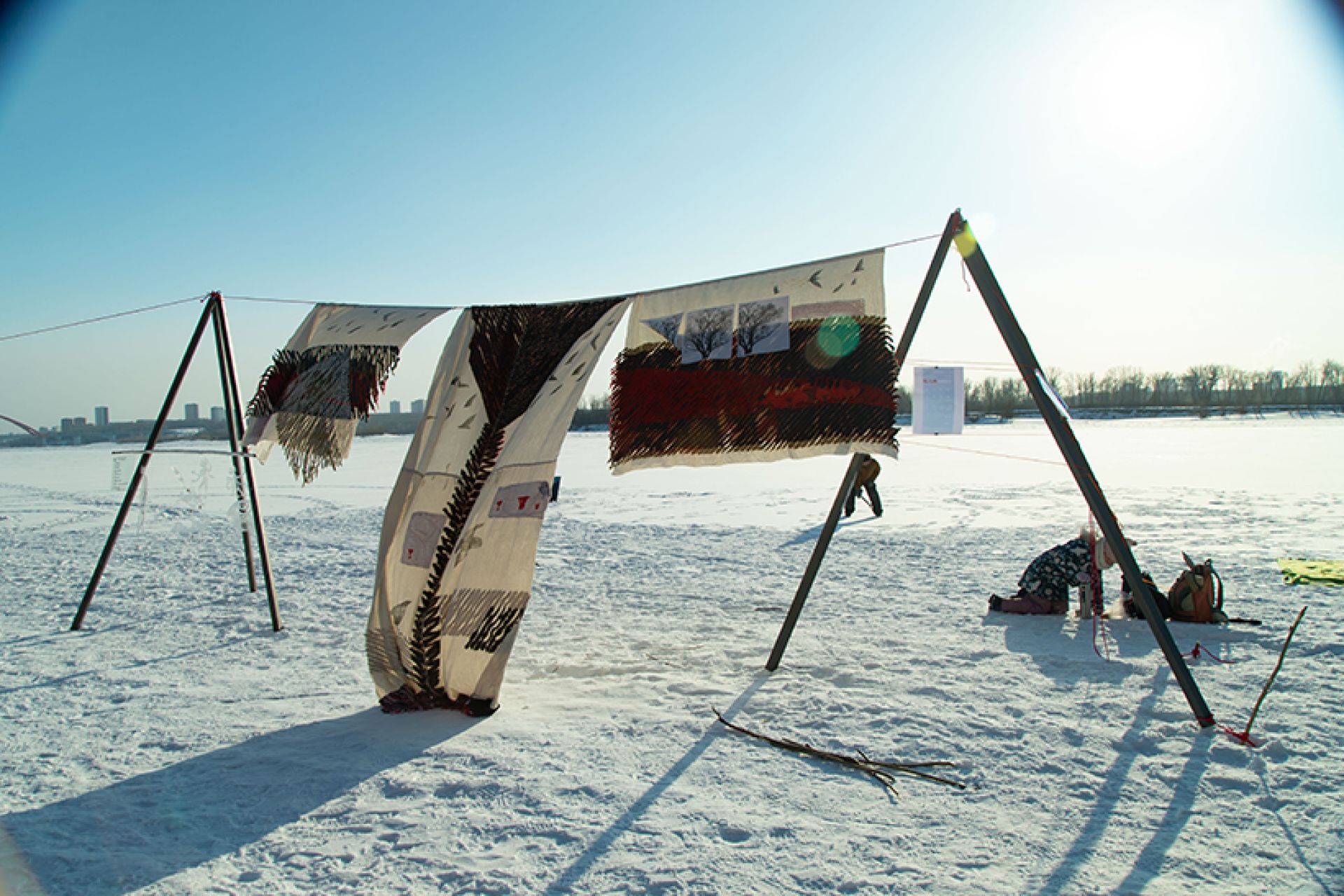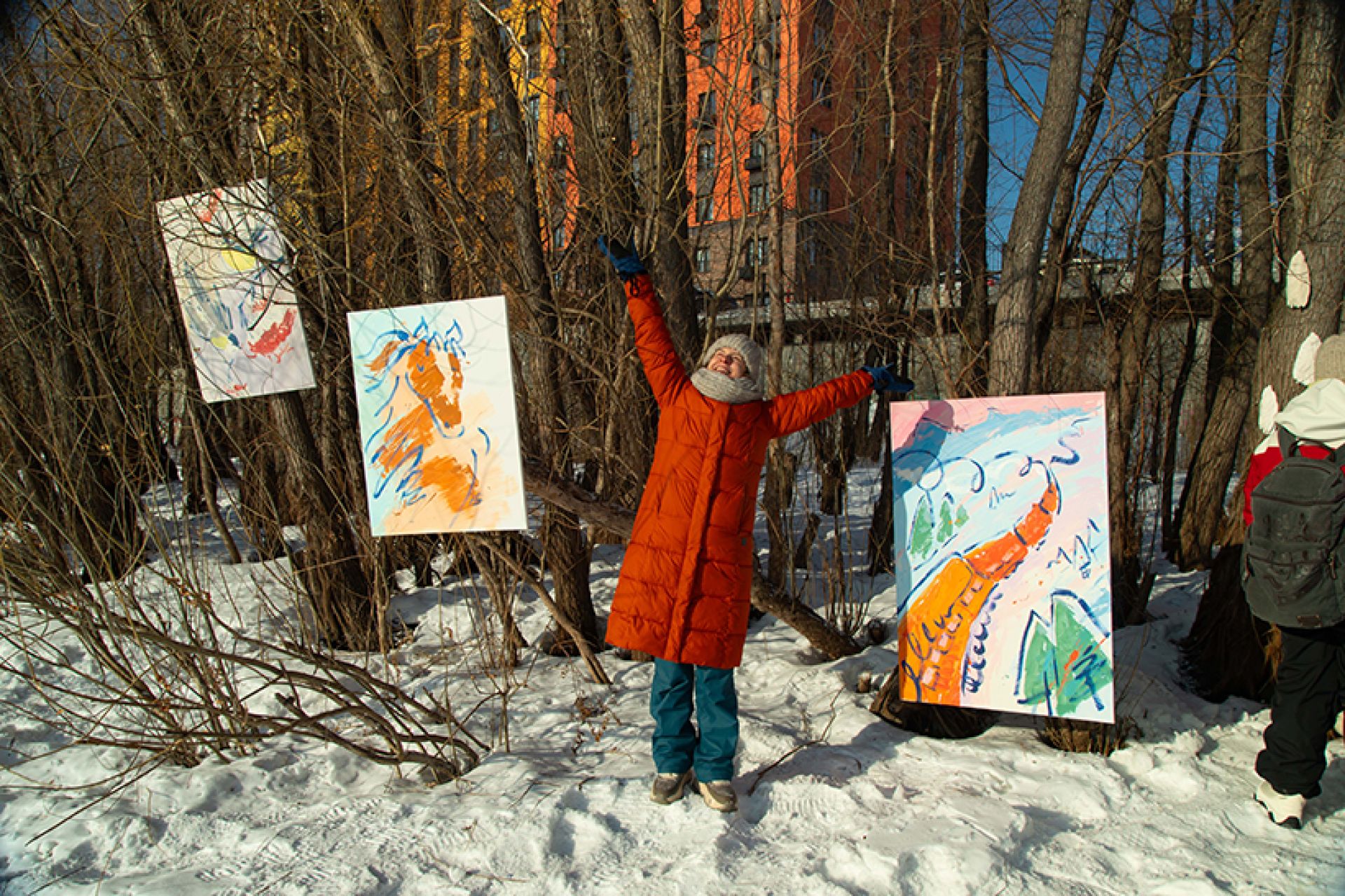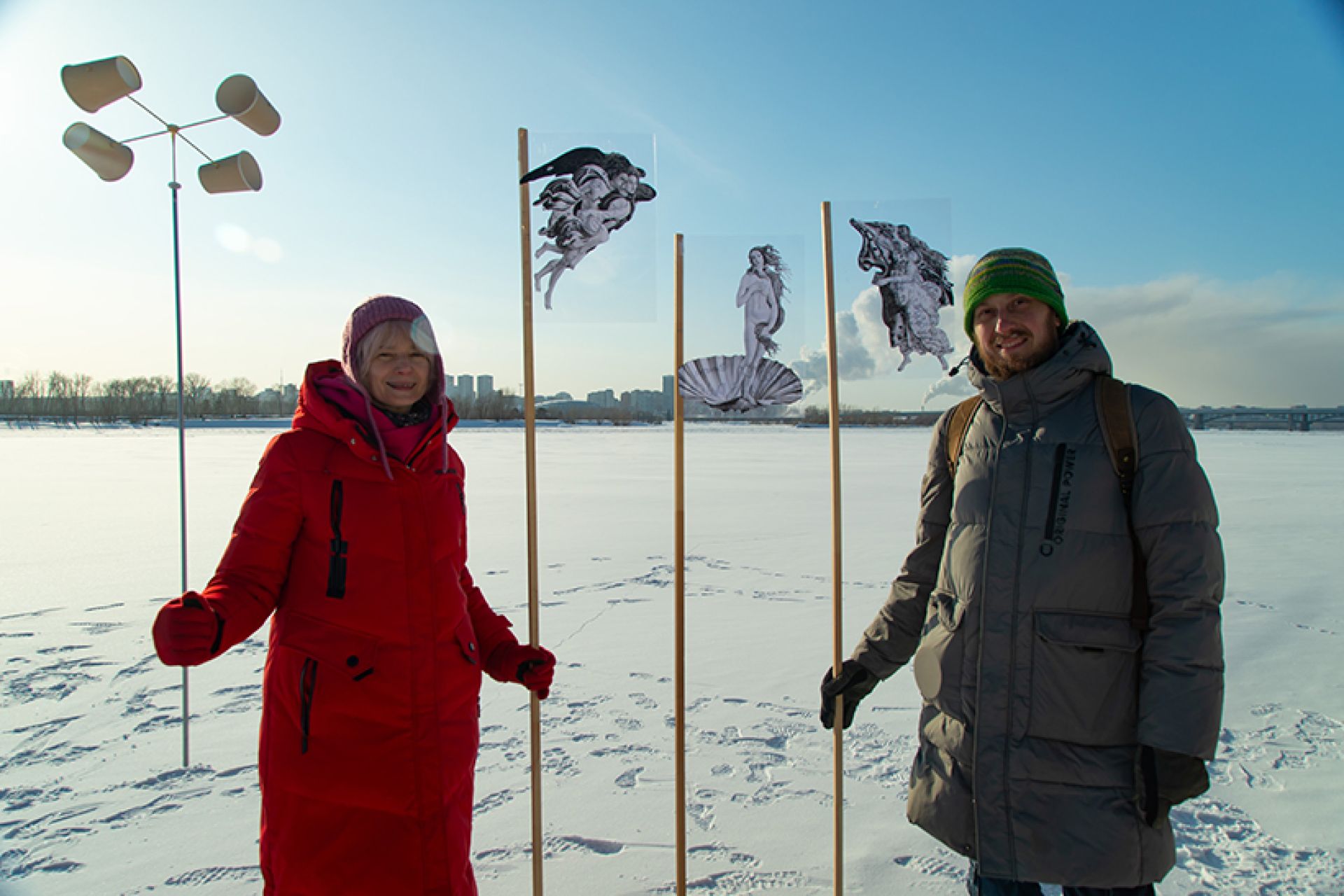 «Ветрено на планетах. Стабильности нет. Так и колышет, и волнует, и манит. Нет, чтобы взять и полежать. Нет. Мы придумали “Снег”»: член Союза художников России, художник Алёна Залуцкая (художественная мастерская «База») организовала беспрецедентное арт-событие: выставка современного искусства на фоне снега и льда сибирского зимнего пейзажа в районе ЖК «Маяк».