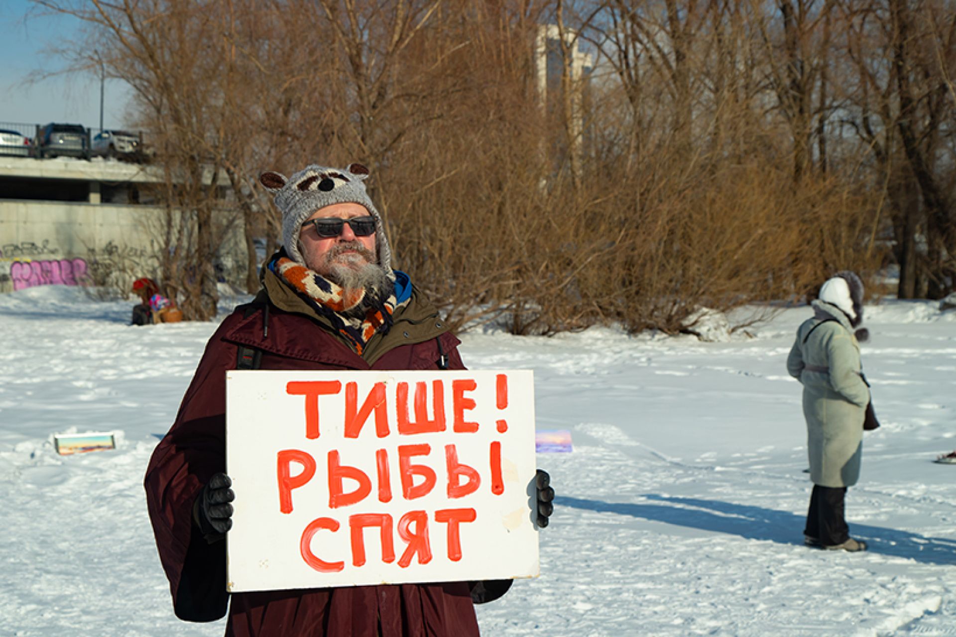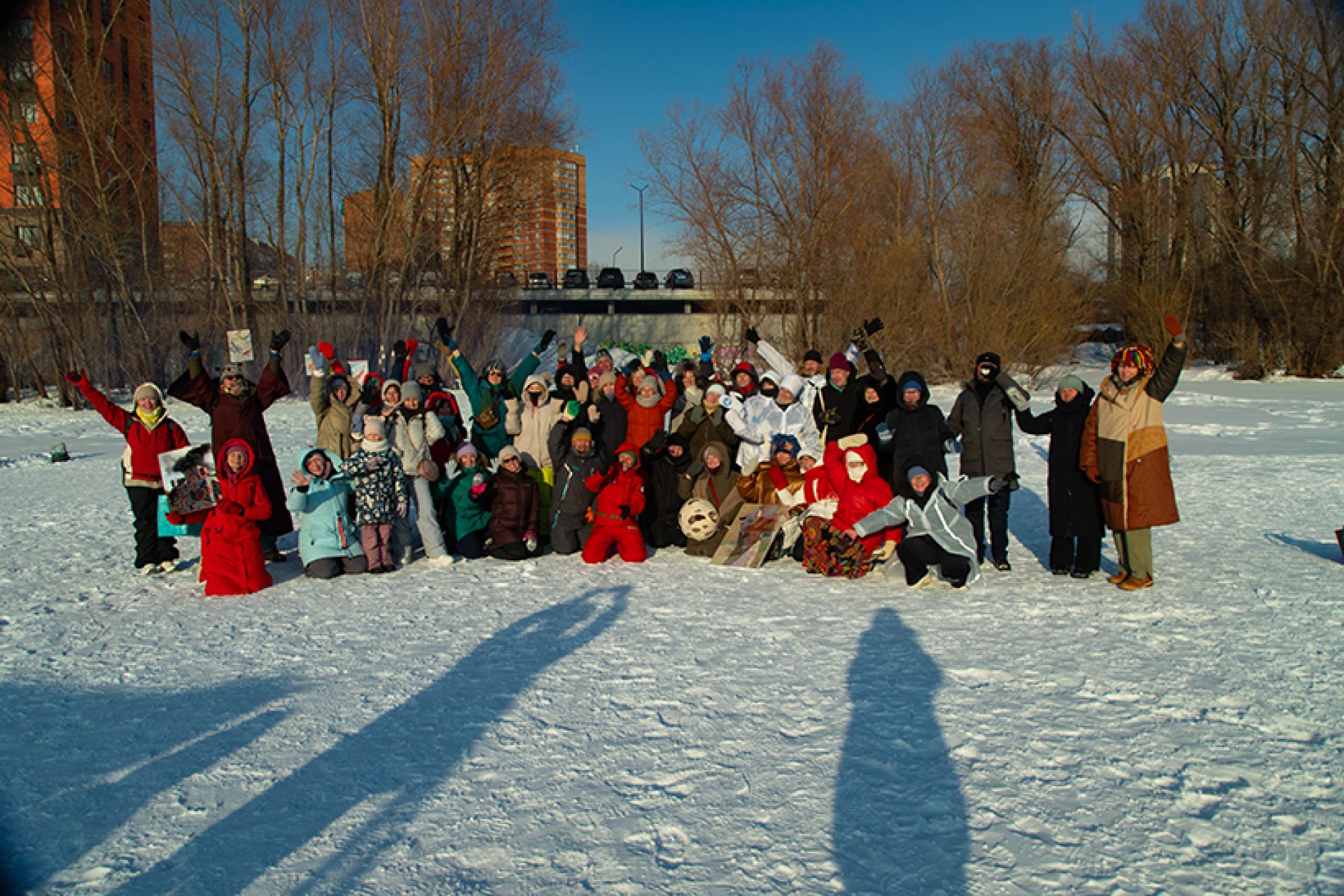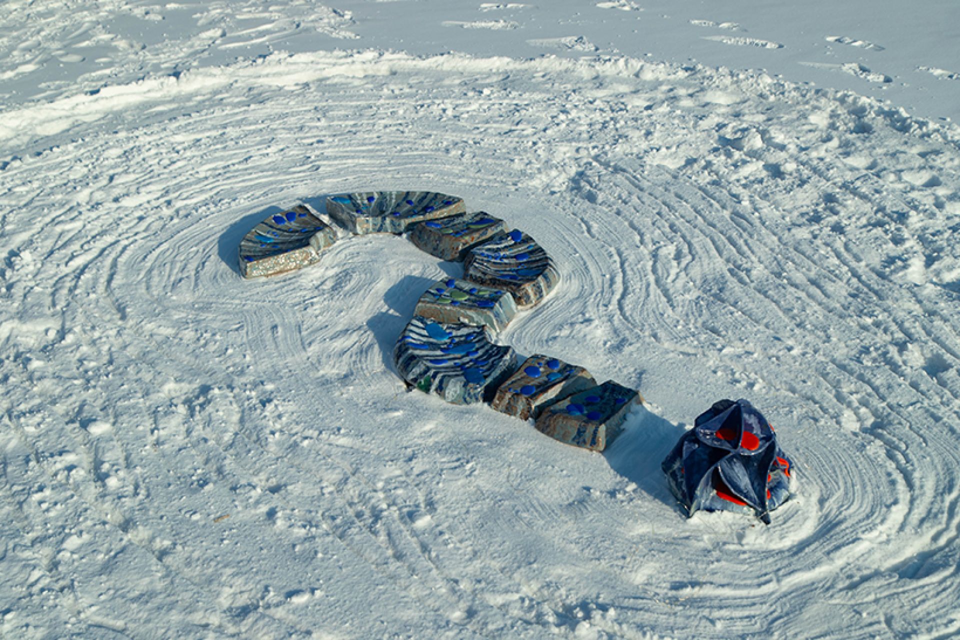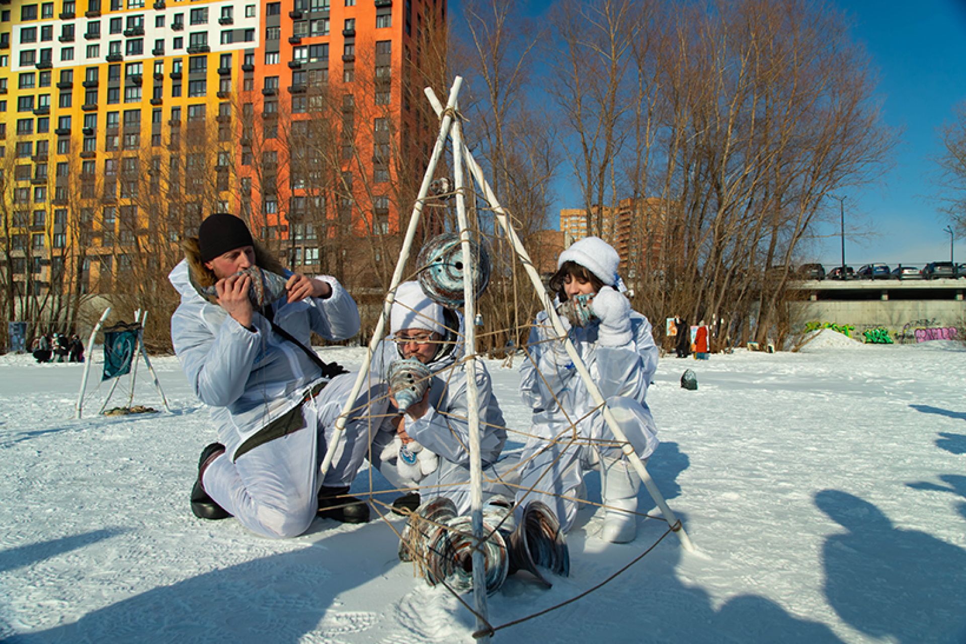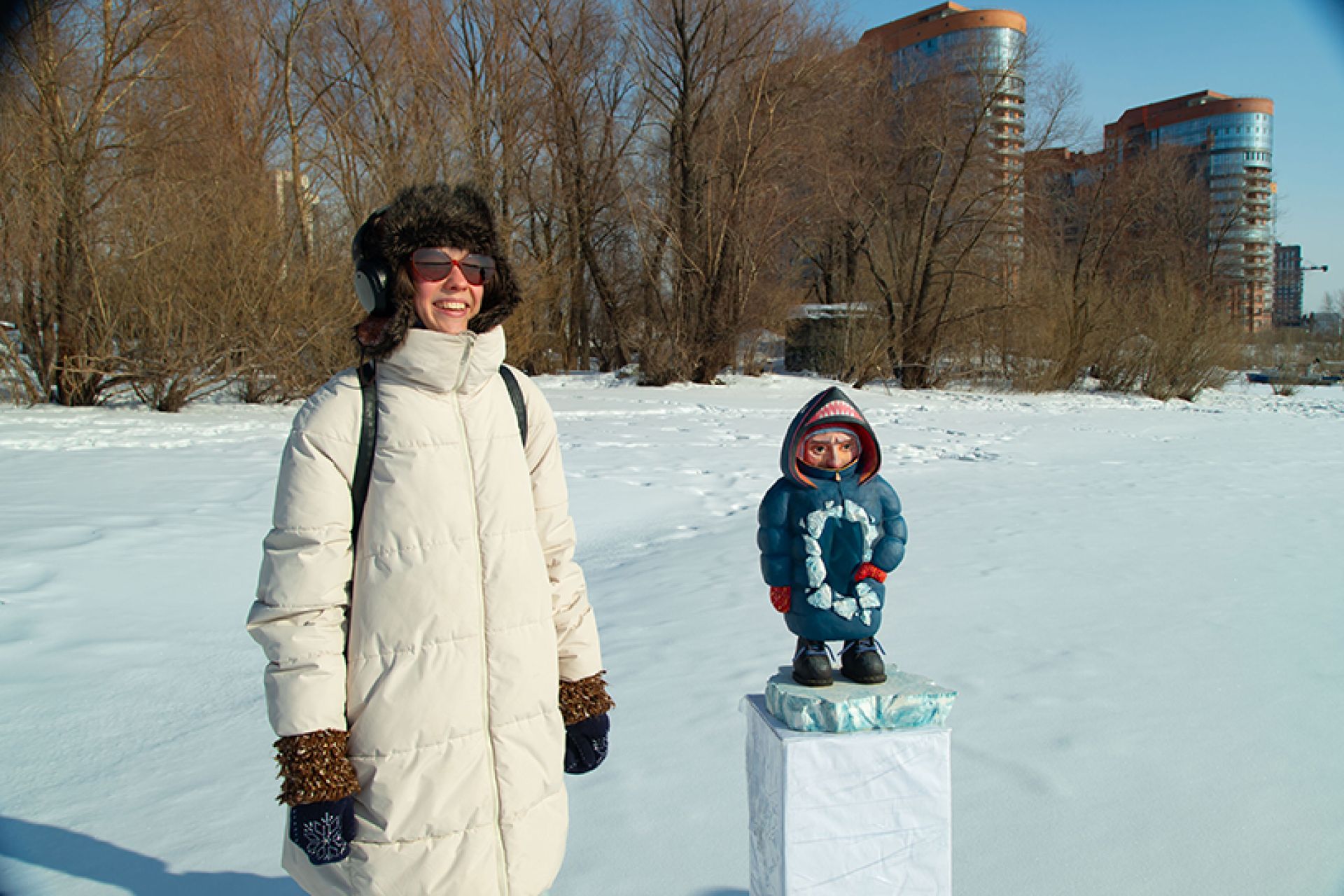 «Ветрено на планетах. Стабильности нет. Так и колышет, и волнует, и манит. Нет, чтобы взять и полежать. Нет. Мы придумали “Снег”»: член Союза художников России, художник Алёна Залуцкая (художественная мастерская «База») организовала беспрецедентное арт-событие: выставка современного искусства на фоне снега и льда сибирского зимнего пейзажа в районе ЖК «Маяк».