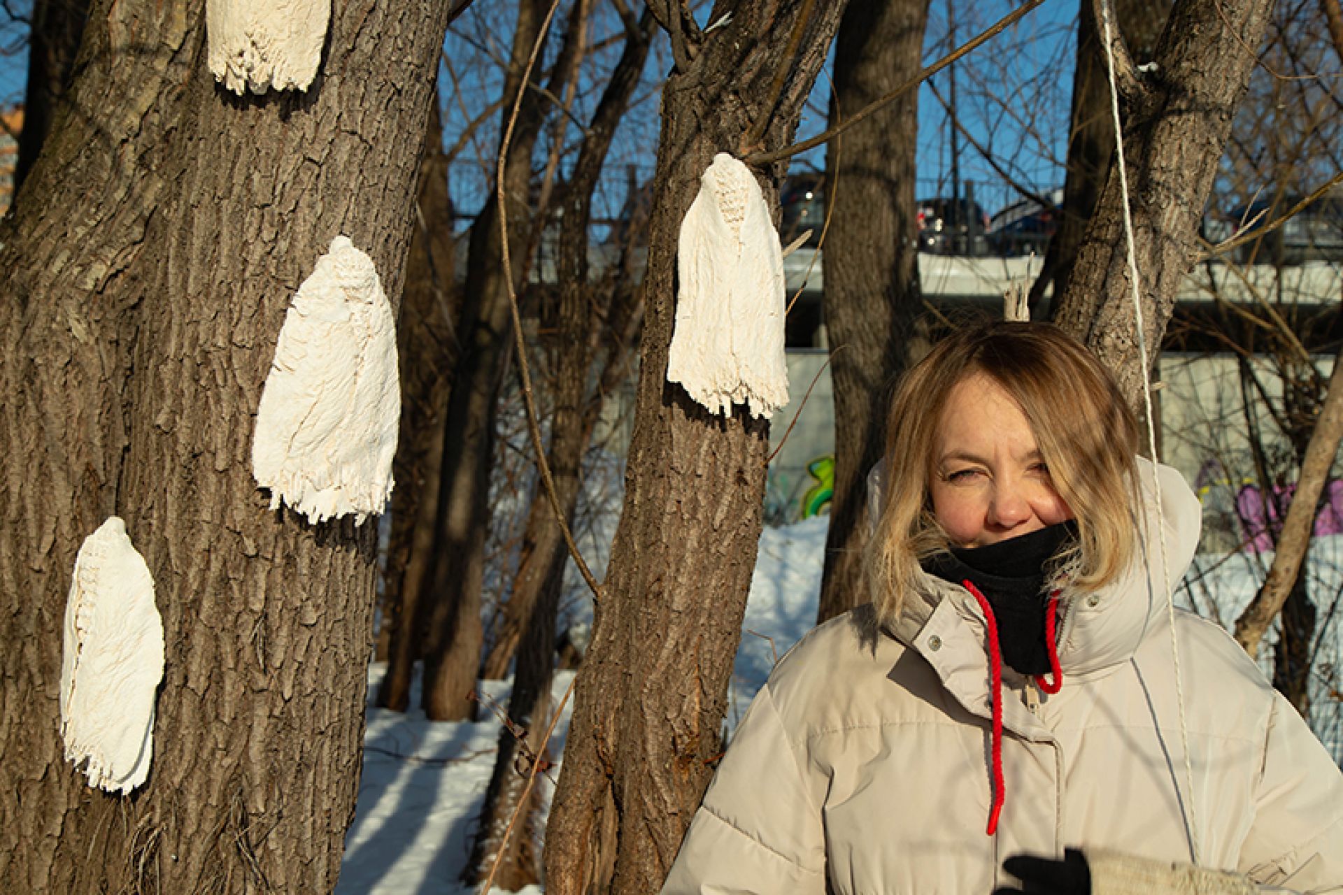 Ветер переносил с одного дерева на другое стайку чешуекрылых. По версии художника, керамиста, руководителя арт-школы «Лето Малевича» Ирины Обуховой, её керамическая, но вполне себе ветреная моль ест не деревья, а снег, приближая весну.
