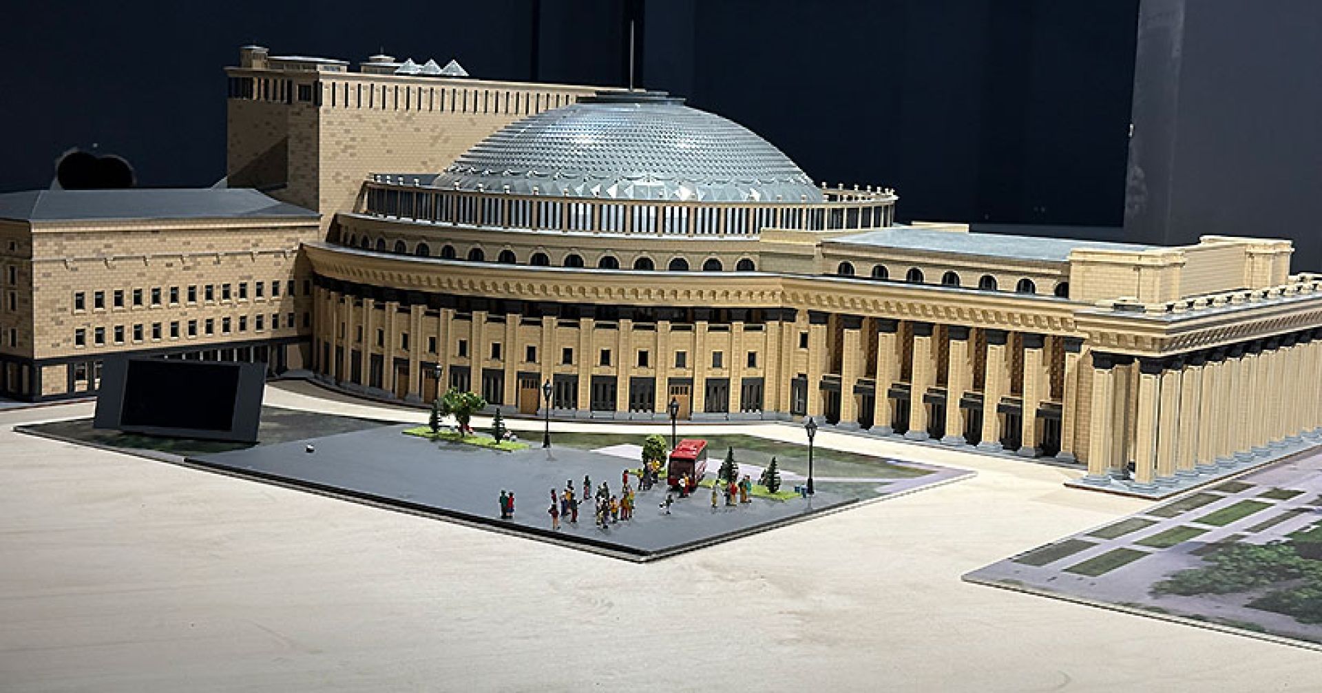 Возведённые здания поражают высокой степенью детализации. Например, макет оперного театра состоит из более чем 4500 элементов. На его строительство мастера потратили три месяца, вручную склеивая каждую часть. При строительстве, а иначе это никак не назвать, даже учли орнаменты на окнах и воссоздали знаменитый барельеф Веры Штейн, который находится за колоннами. И, конечно же, купол украшают знаменитые «чешуйки». А за театром поставили фигуру лошади. Это отсылка к премьере оперы Михаила Глинки «Иван Сусанин», когда на сцену вышла живая лошадь.