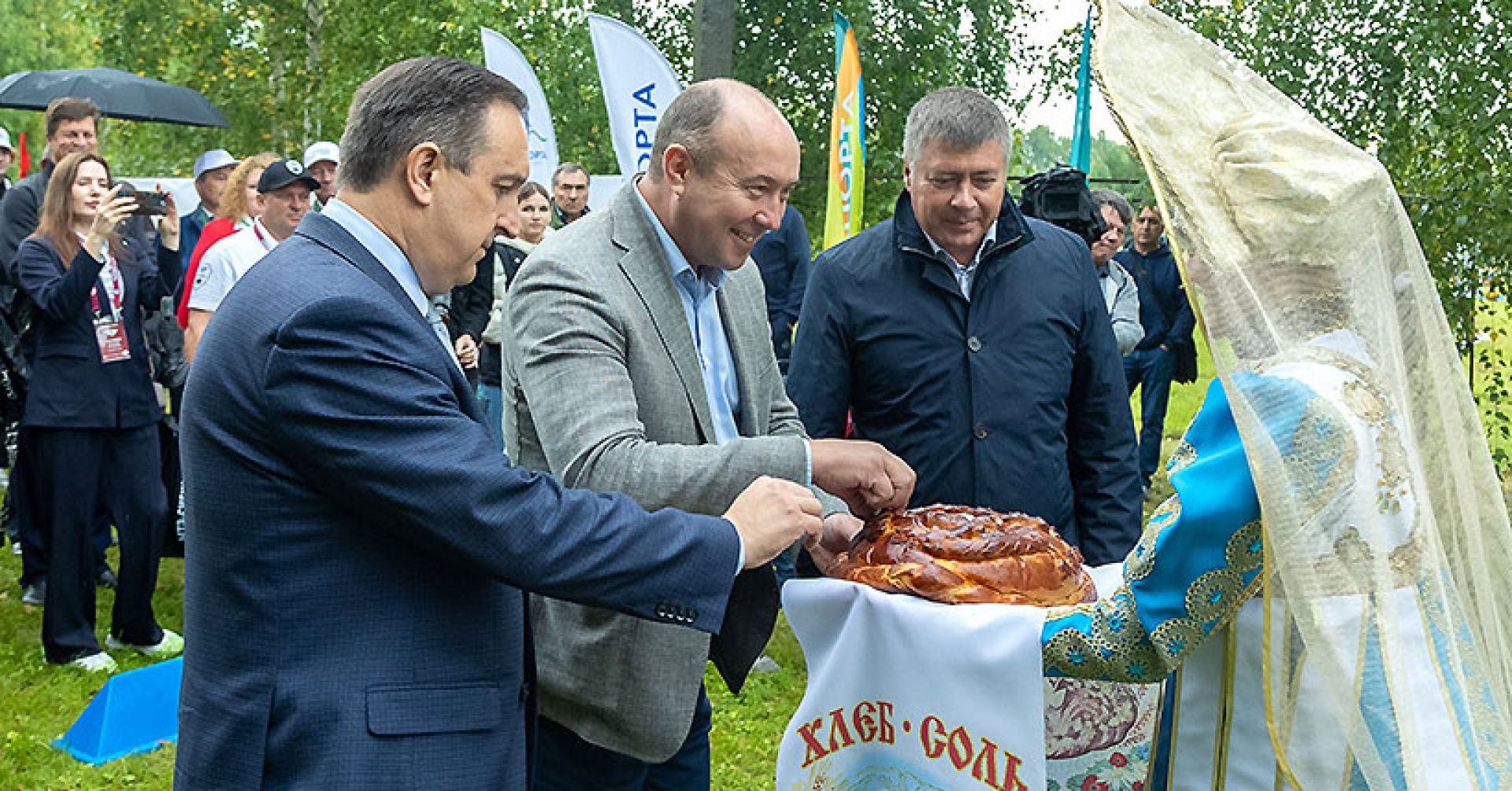 Хлеб-соль для дорогих гостей: глава Колыванского района Евгений Артюхов, министр сельского хозяйства НСО Андрей Шинделов и министр физической культуры и спорта Сергей Ахапов.