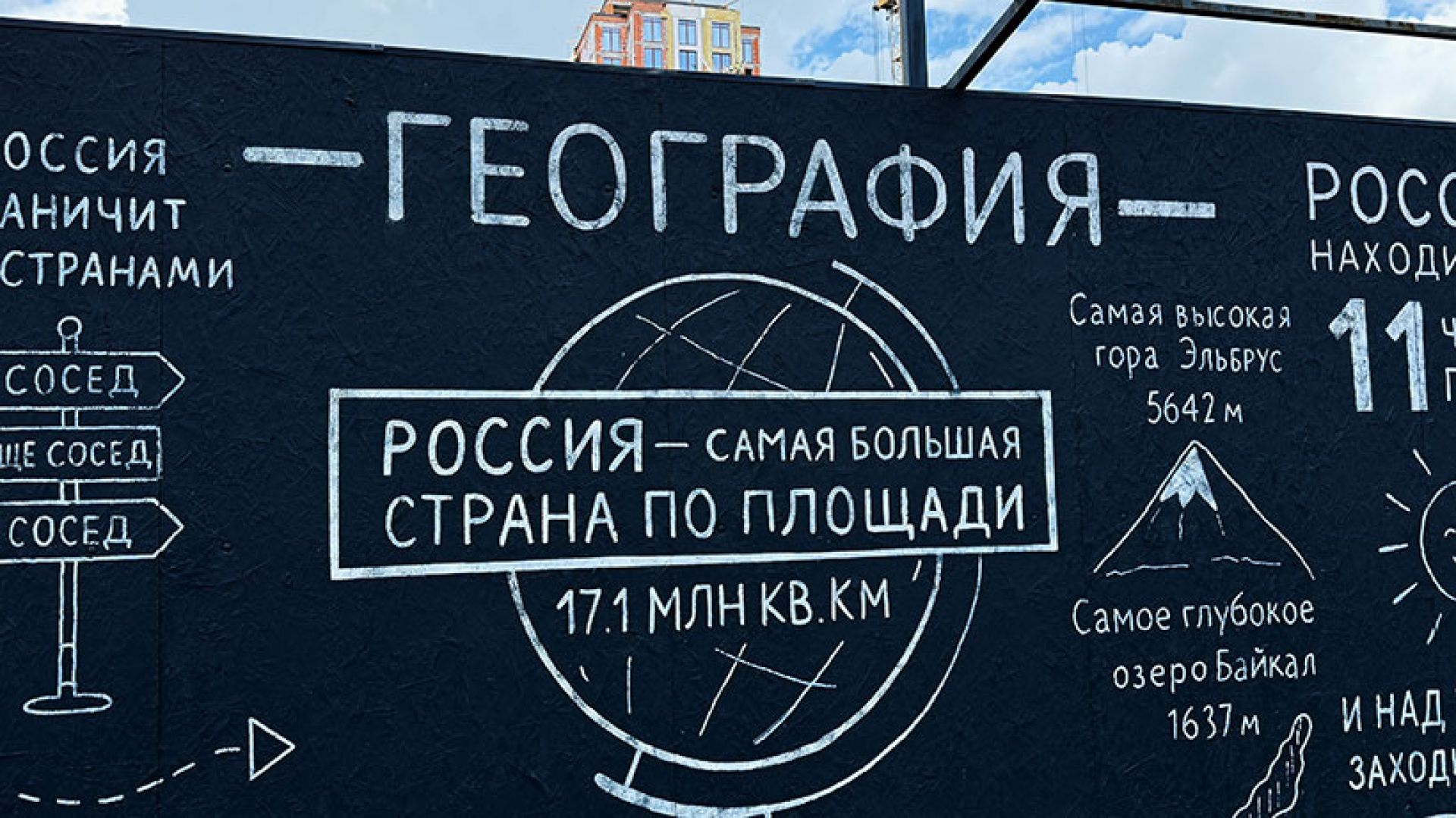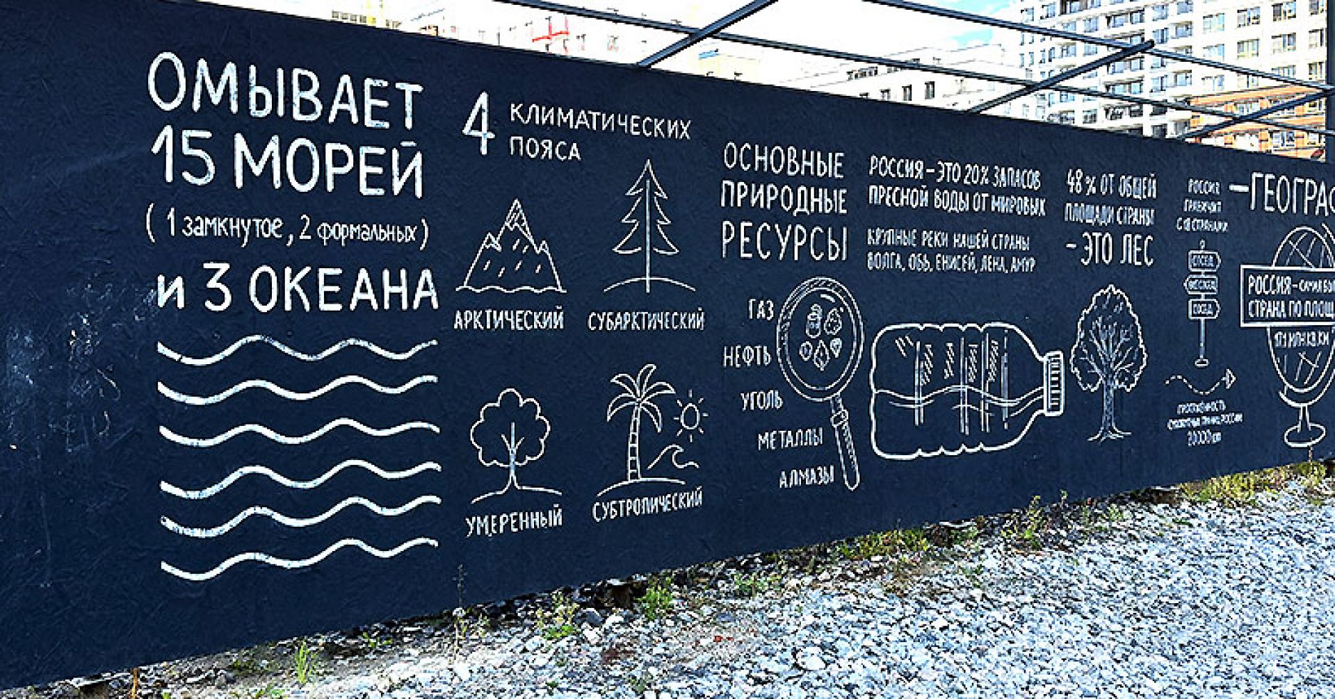 — Рядом возводится новая школа, а прямо напротив забора уже стоит школа №220. Отсюда и родилась мысль — разместить на заборе своего рода «шпаргалки». Конечно, можно было бы попытаться уместить всю программу старших классов, но тогда разглядывать надписи пришлось бы с лупой. Поэтому мы сосредоточились на темах, которые чаще всего вызывают затруднения у современных школьников, фундаментальных формулах по физике и интересных фактах по географии. Моя задача заключалась в том, чтобы упорядочить этот массив информации и превратить его в цельную визуальную историю, — рассказал художник.