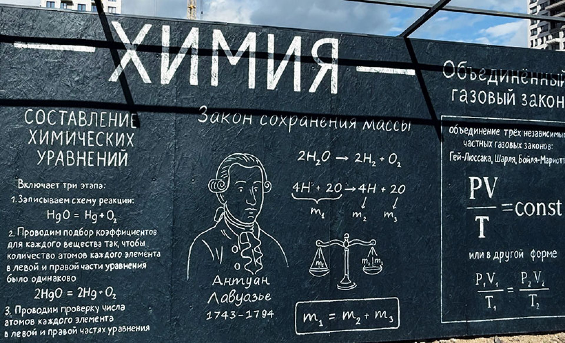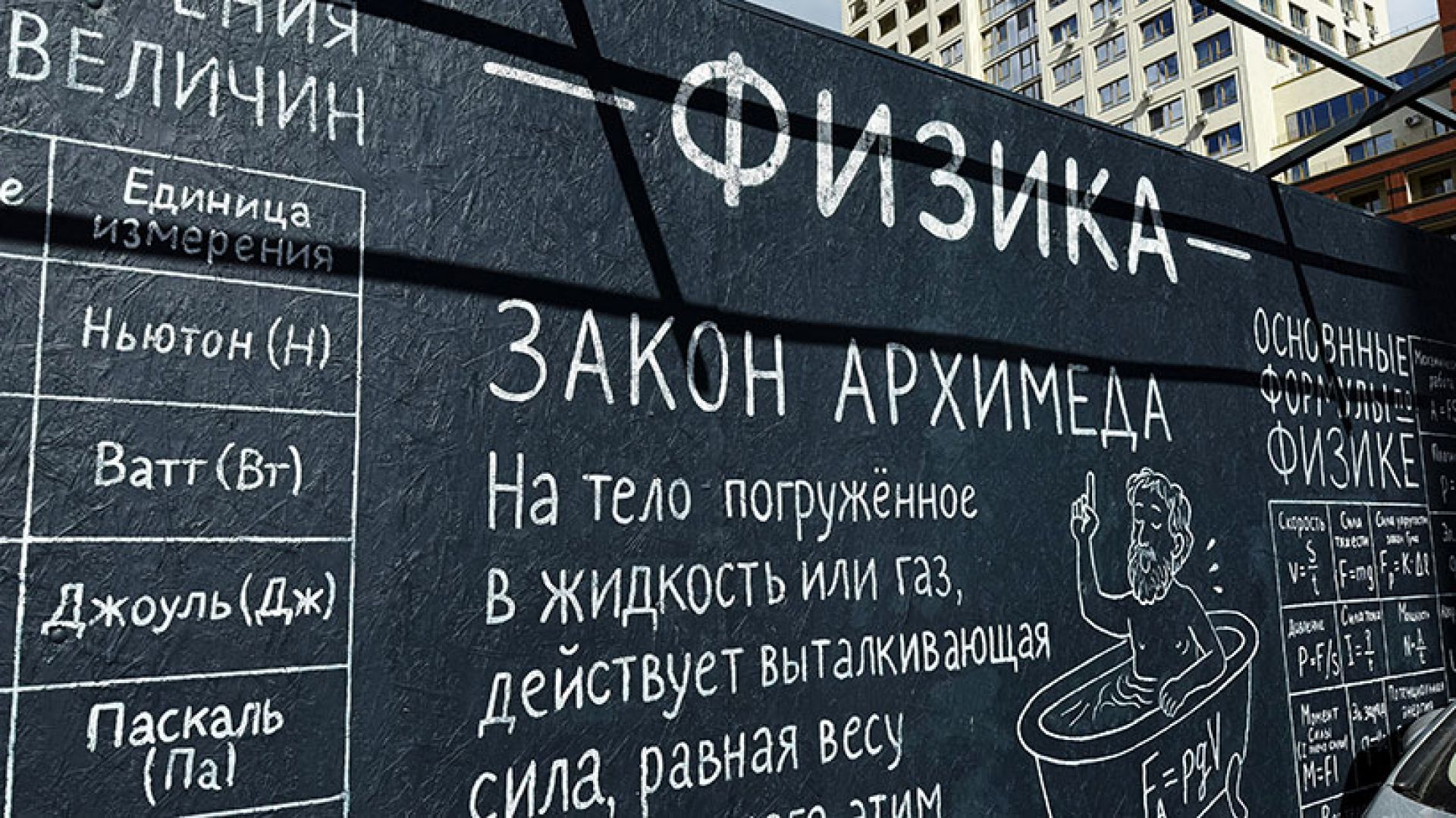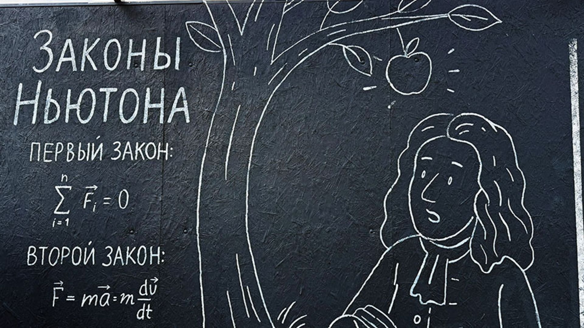 Но было бы скучно, если бы на чёрной поверхности были изображены только правила, теоремы и формулы. Поэтому художник сопроводил их иллюстрациями, чтобы прохожему было приятно «пробежаться глазами» по забору и прочитать всё целиком. Так, падение яблока на голову Исаака Ньютона, портреты исторических личностей и молекула ДНК действительно цепляют и даже помогают запомнить эту базу.