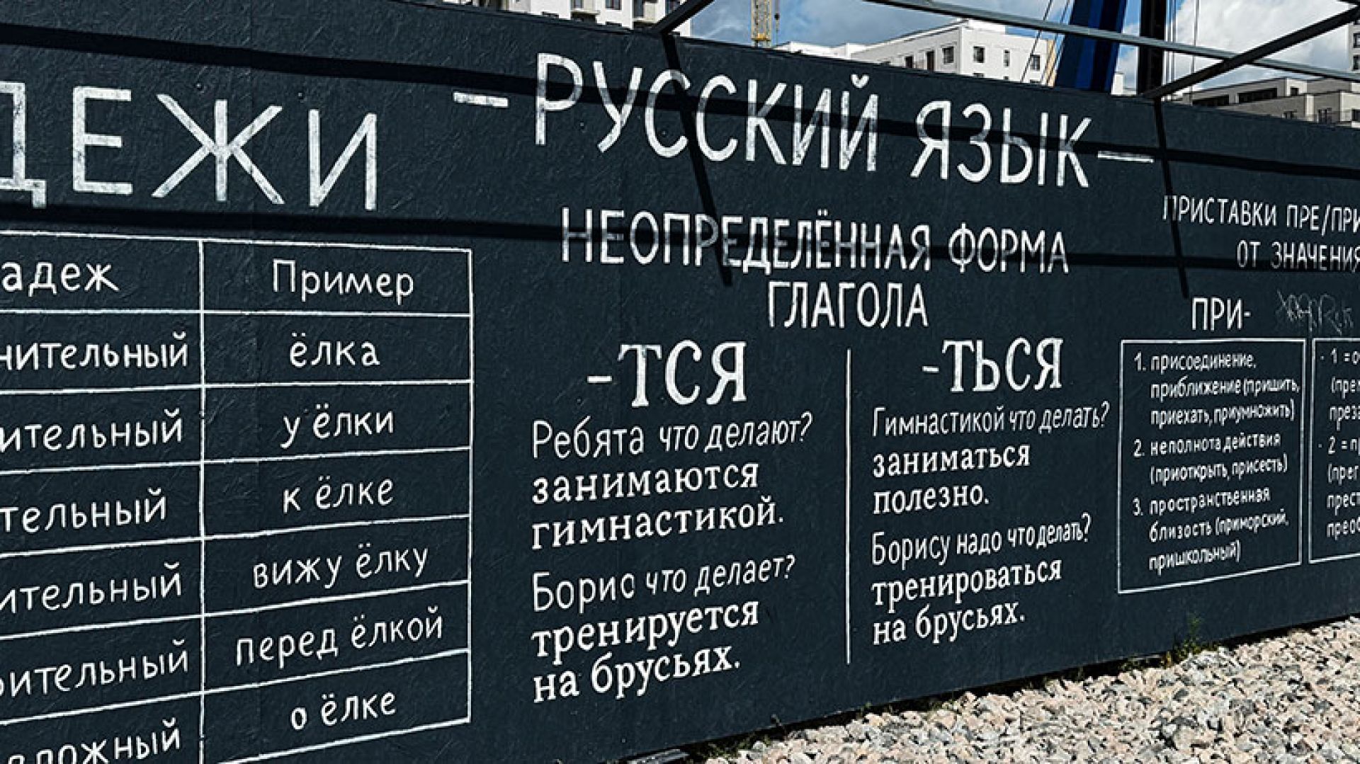 Фанерный забор вокруг строящейся школы застройщик решил превратить в… гигантскую шпаргалку. На 350 квадратных метрах белой краской легло то, что не лишним будет вспомнить и нынешним школьникам, и взрослым.