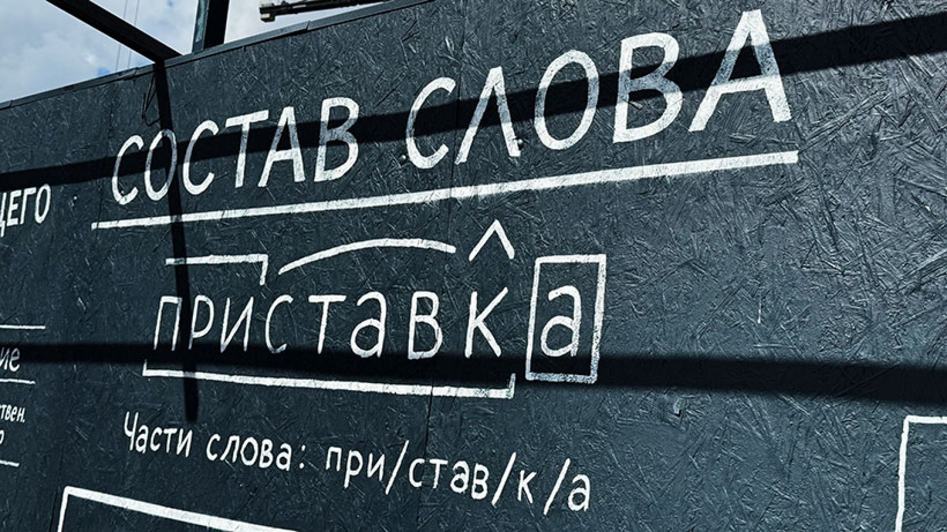 Каждая часть забора посвящена одному из семи ключевых школьных предметов. Крупным шрифтом написано, в каких случаях пишется «-тся», а в каких — «-ться», единицы измерения массы, основные природные ресурсы, дата отмены крепостного права, разбор таблицы Менделеева, закон Архимеда и строение растительной клетки.