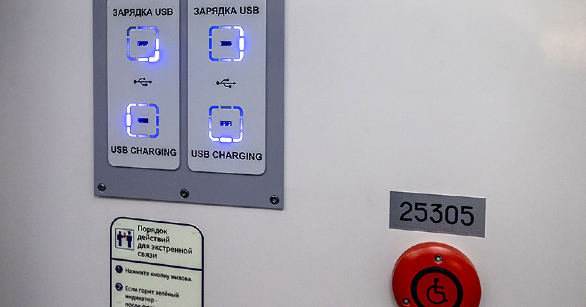 Каждый вагон нового поезда оснащён двумя точками для зарядки гаджетов.