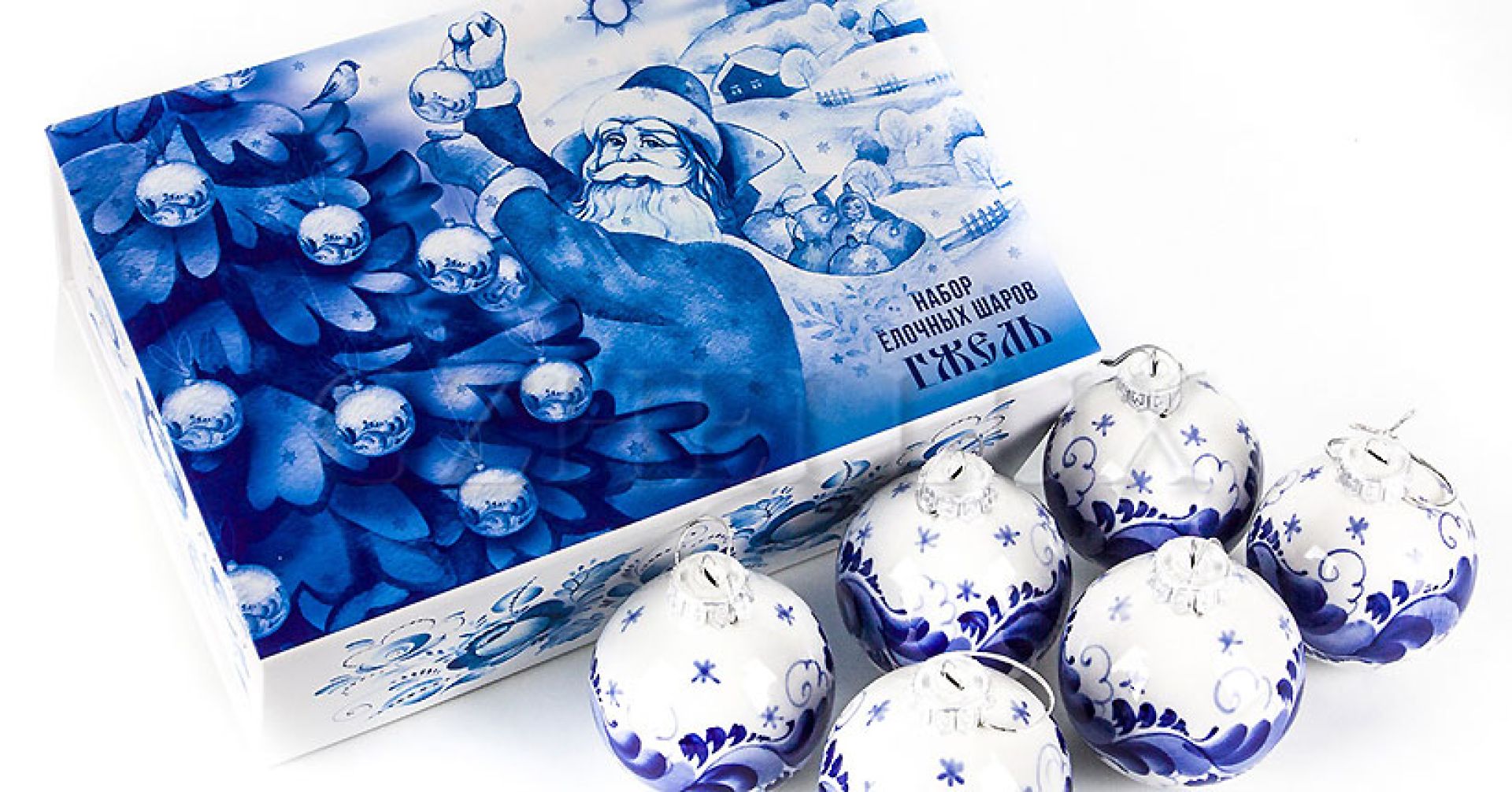 В России немало фабрик выпускает разнообразные новогодние игрушки — как стилизованные под ретро, так и с авторскими сюжетами. Бело-синие фарфоровые игрушки в стиле гжель добавят национальный колорит в убранство новогоднего дерева. Гжельская роспись выполняется вручную кобальтовыми красками, которые после обжига приобретают синий цвет. На сайте gzhellux.ru представлены как наборы ёлочных шаров по цене 5340 рублей, так и украшения по отдельности: Дед Мороз, Снегурочка и Снеговик — по 1800 рублей.