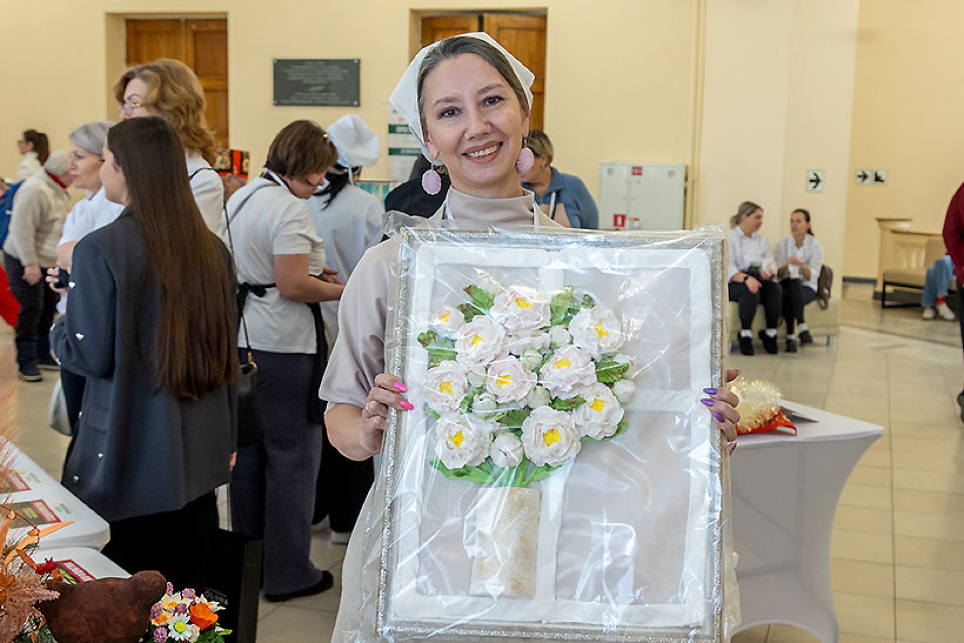 Сладкая флористика сегодня — очень популярная тема. Ольга Ермолина, кондитер-любитель, представила картину с зефирными пионами. Ольга очень любит пионы, поэтому выполнила букет именно в виде этих цветов и положила их на «морозное» стекло. А ещё надела «зефирные» серьги.
