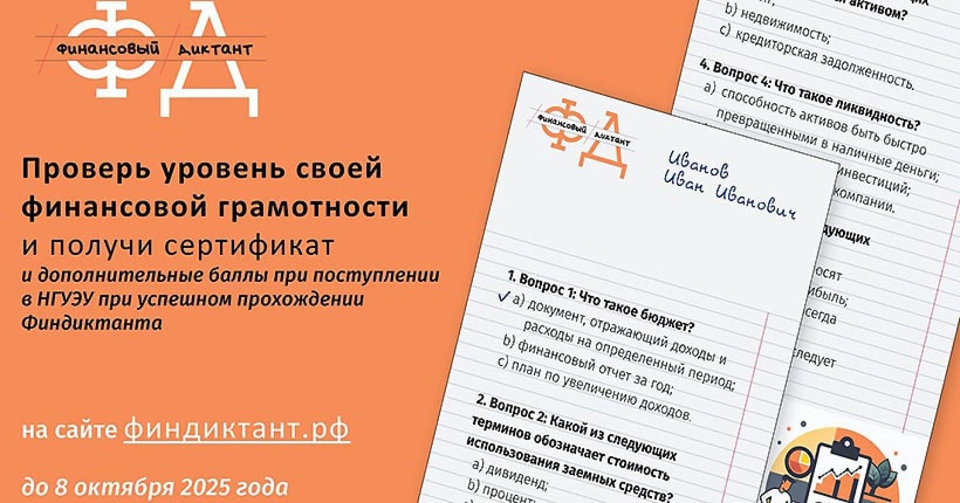Ежегодный «Финансовый диктант» — это не экзамен, а возможность проверить свои знания в условиях, максимально приближенных к жизни, и получить новые. Участвуйте и прокачивайте свою финансовую грамотность вместе с Домом финансового просвещения и НГУЭУ!