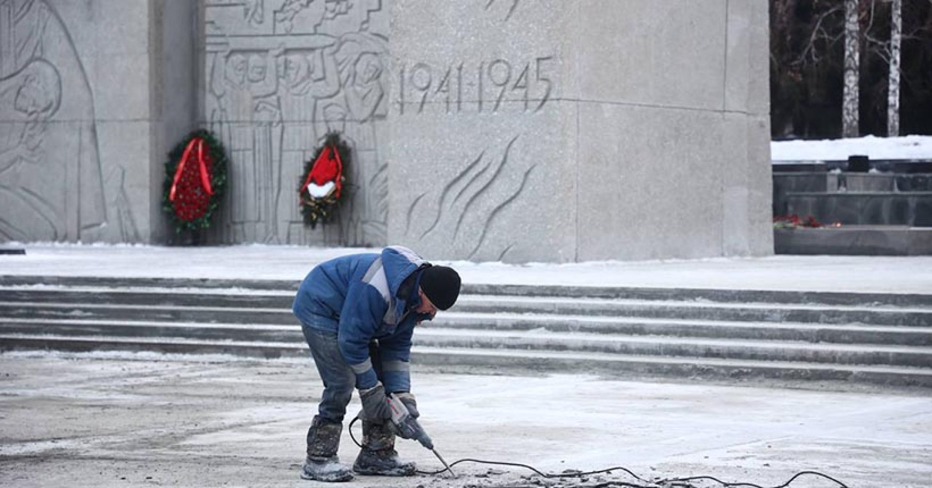 — Ремонт продвигается по графику, готовность — более 90%. — прокомментировал он. — На площади у Вечного огня полностью заменено основание, устроена новая армированная плита, залит мозаичный бетон из белого цемента, выполнена заливка швов и первичная шлифовка. Весной завершим финальную обработку поверхности. На площади Подвига основные строительные работы также завершены: заменено основание, выполнена новая плита, уложено мозаичное покрытие. Сейчас продолжается шлифовка.