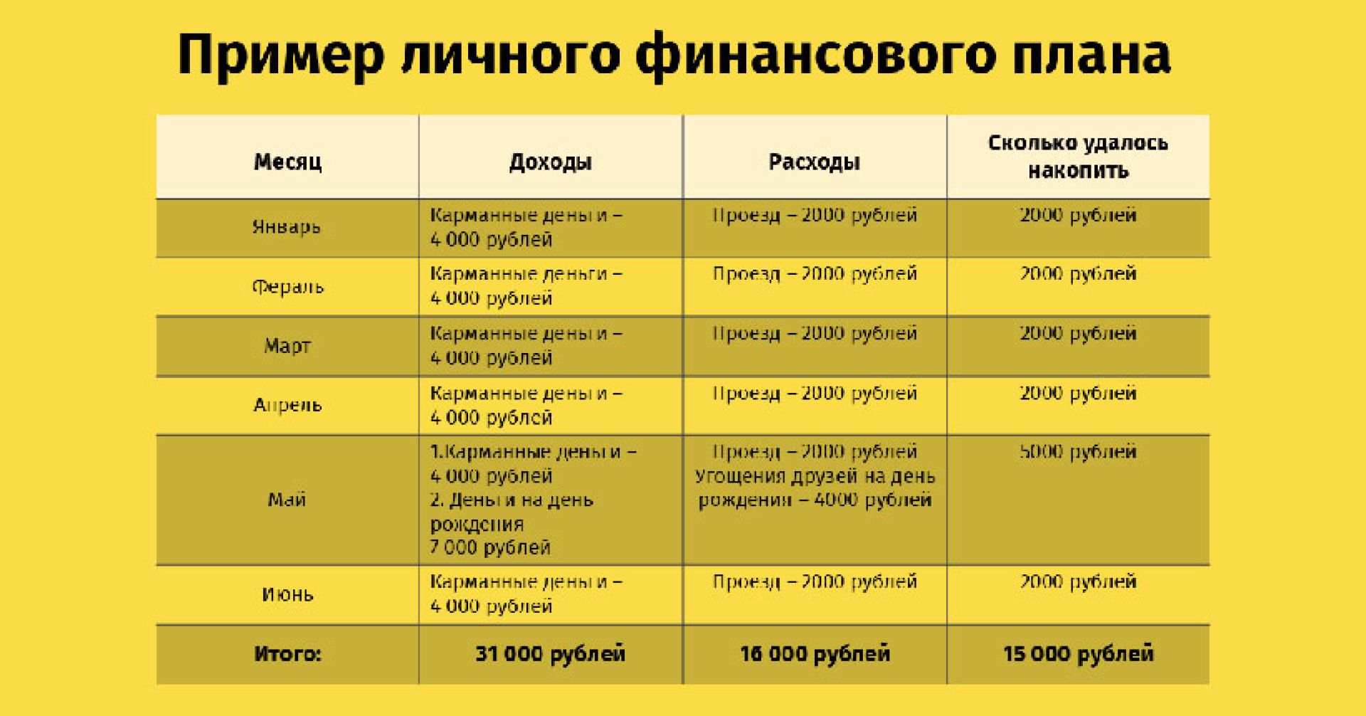 Благодаря личному финансовому плану ты сможешь учитывать доходы и расходы и корректировать свои траты. Вот вариант оформления такого плана.