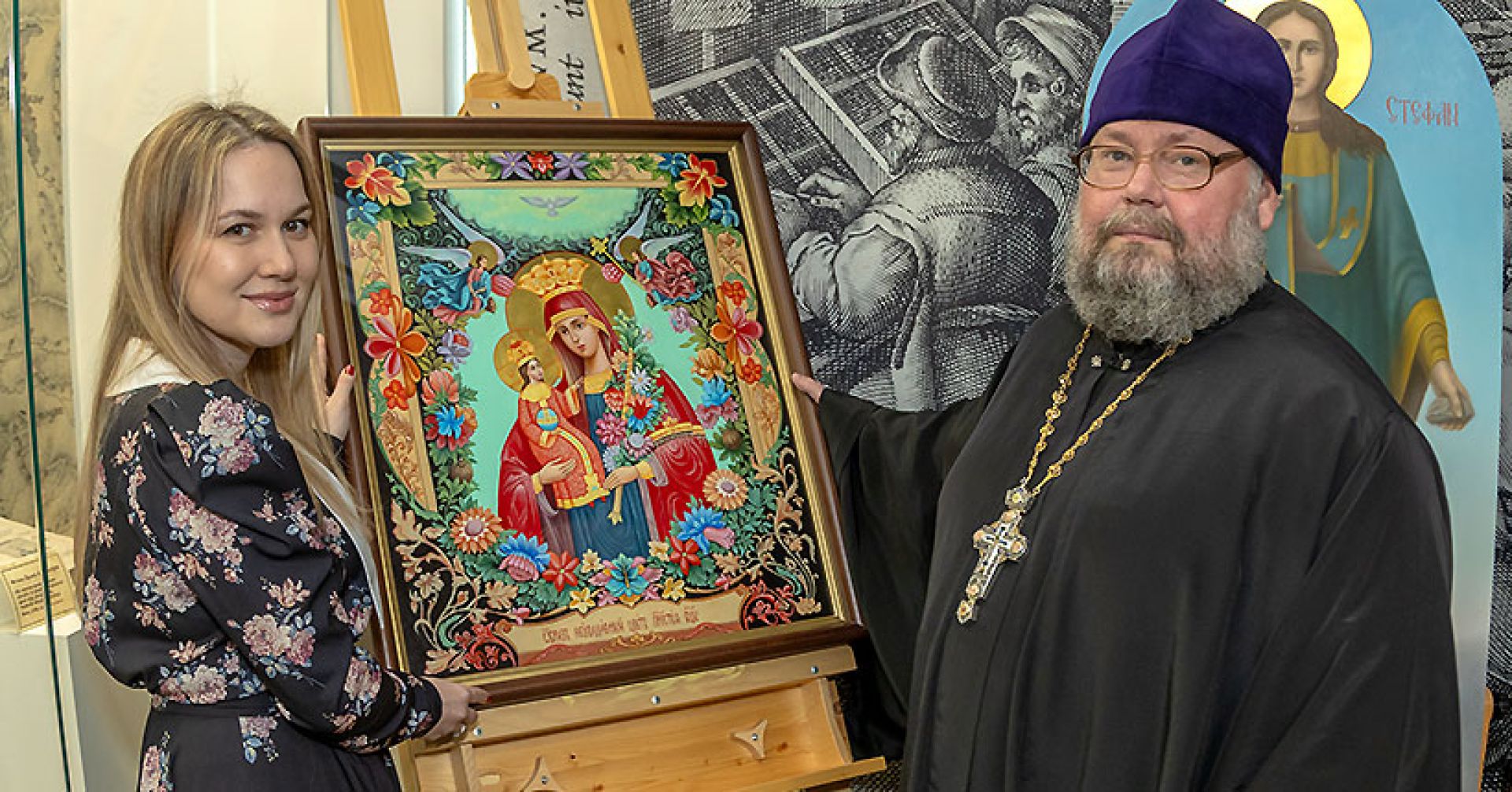 Алёна Гришунина и духовник мастерской, священник Собора Александра Невского протоирей Владимир Бобров.
