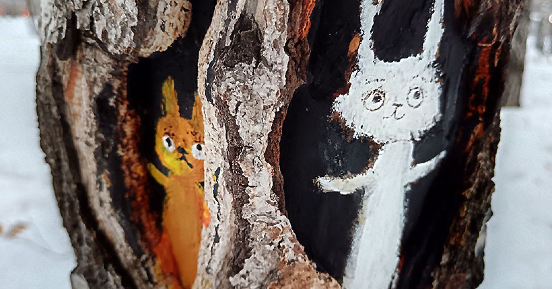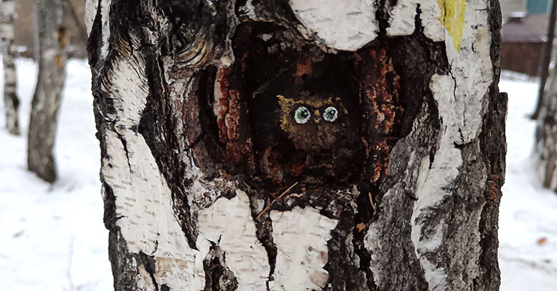 Чтобы увидеть ещё одно маленькое чудо, садитесь в метро и езжайте до станции «Октябрьская». Этот путь можно пройти и пешком. Здесь в скверике вдоль аллеи с лавочками в дуплах деревьев спрятались весёлые зверюшки и птицы: белочки, лисички, ёжики, медвежата, совята и синий аист. Ими несколько лет назад населила сквер иллюстратор детских и взрослых книжек Диана Гаязова-Чернышова. Каждый год художница подкрашивает своих питомцев, впрочем, они уже не её, а общие.