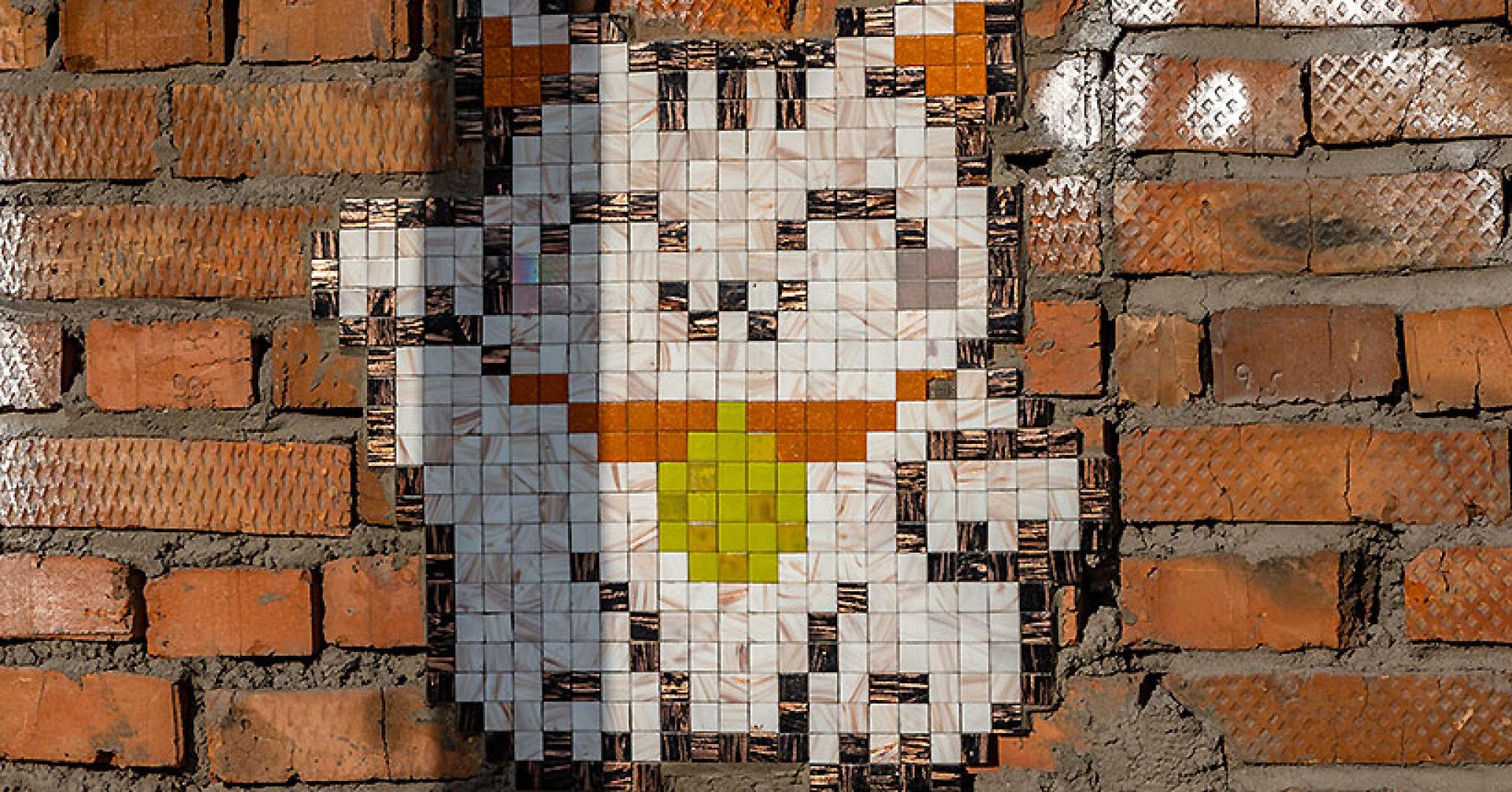А теперь сверните налево от входа в кинотеатр. Милый Снуппи с сердечком и крошечные влюблённые черепашки на стене подарят вам прекрасное настроение! Пиксельные зверюшки — это тоже работы Галины Машнёвой и её мастерской. Сначала автор украшала ими обветшалые стены заброшенных зданий, а потом перебралась в центр. Теперь уже с одобрения законных владельцев тех или иных учреждений.