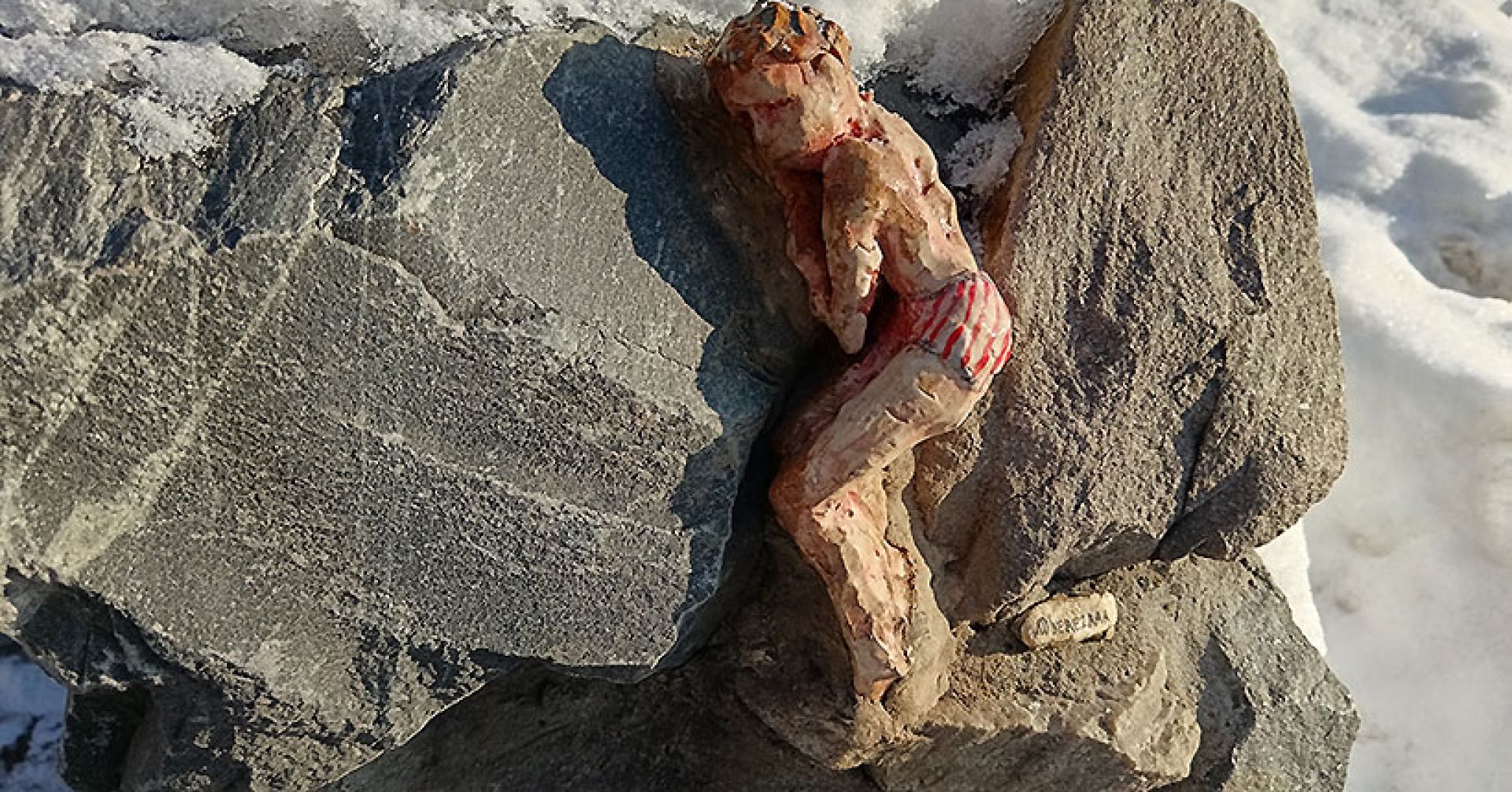Пройдите по улице Ленина до пересечения с Советской. Ровно посередине углового здания, рядом со входом в Музей связи, спрятался крошечный малыш. Его поселила здесь питерская актриса и художница Екатерина Берязева. Катя «лечит» стены зданий и сооружений — те, где есть трещины. Она посылает им и нам свои творения — милых грустных человечков-ангелов, задумчиво смотрящих в небо и в бесконечность. Они про одиночество и дружбу, про то, как хрупок мир и короток миг. Найти малышей непросто, но у вас получится!