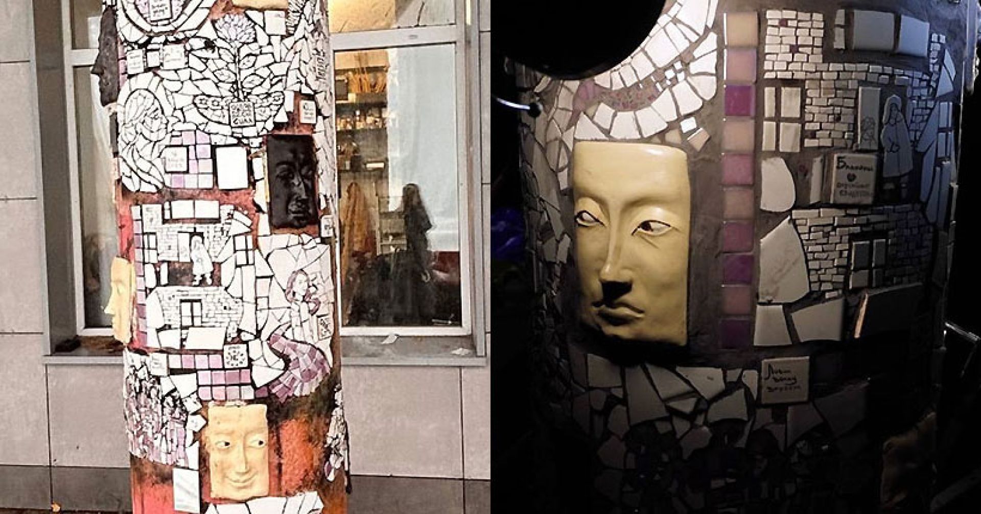 Это ещё один «академовский» проект школы керамики ArtChaos, который получил название «Всяко бывает» и разместился на колонне у ДК «Юность». По мнению авторов, название очень подходящее — на колонне собраны на керамических плитках небольшие зарисовки из жизни всех, кто захотел ими поделиться. А ещё здесь приклеены маски и зеркала, так что каждый прохожий сможет стать частью проекта.