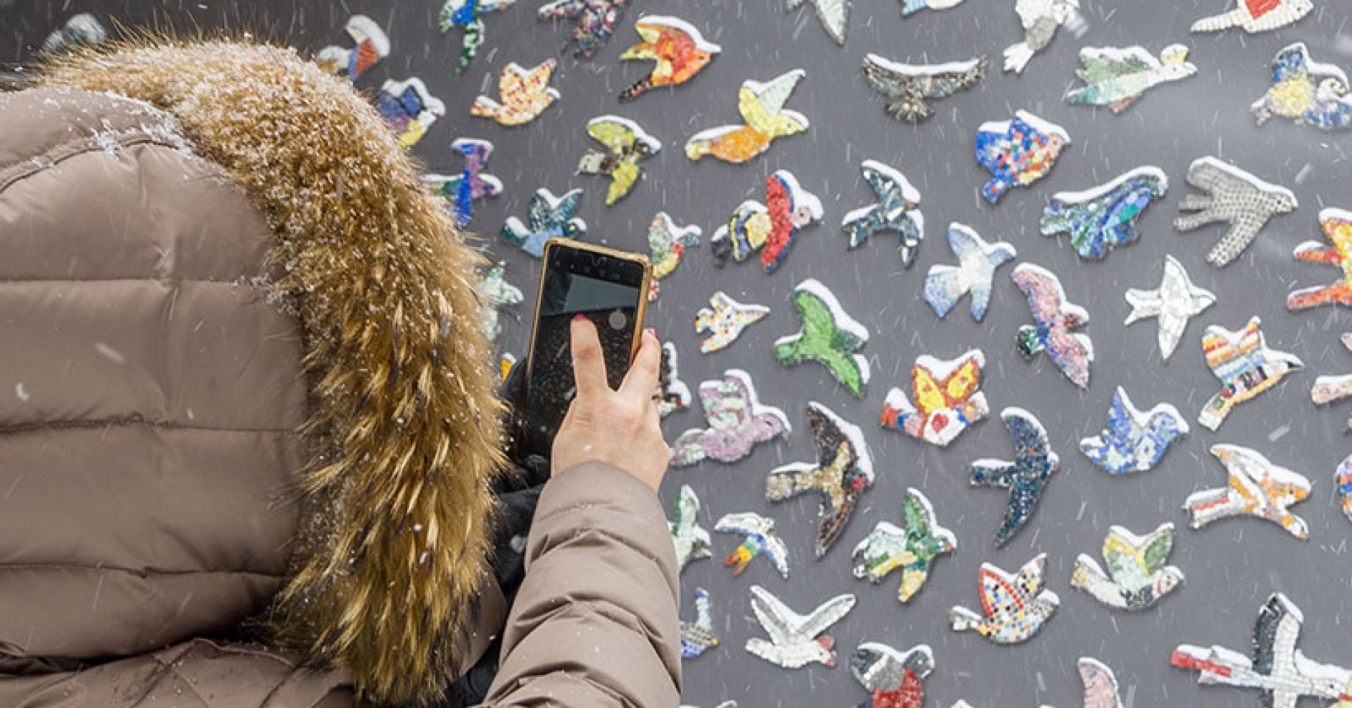 Встаньте лицом к кинотеатру «Победа» и сделайте несколько шагов вправо. Здесь, на правом крыле, взмахнули крыльями птицы. Огромная стая: ласточки, стрижи, воробьи, чайки, совушки и даже аисты — и нет двух одинаковых. Найдите свою и загадайте желание.
