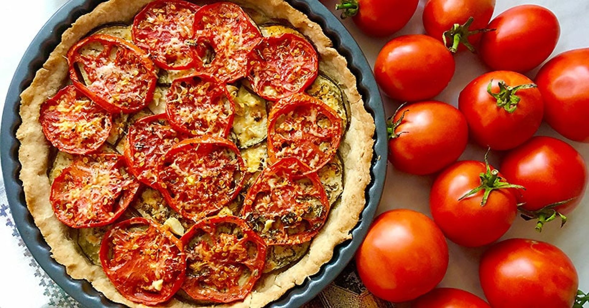 Для этого открытого пирога используйте песочное тесто, рецепт которого приведён выше. Алгоритм тот же — форму с тестом поставьте на 5 минут в хорошо разогретую духовку. Остудите и выложите натёртый сыр, например, сулугуни, который прекрасно плавится. На сыр — кружочки обжаренных или запечённых в духовке баклажанов, на баклажаны — свежие помидоры. Слои овощей посолить, поперчить, можно добавить прованские травы и сбрызнуть оливковым маслом. Получится пирог в итальянском стиле, но с сибирскими овощами и колоритом!