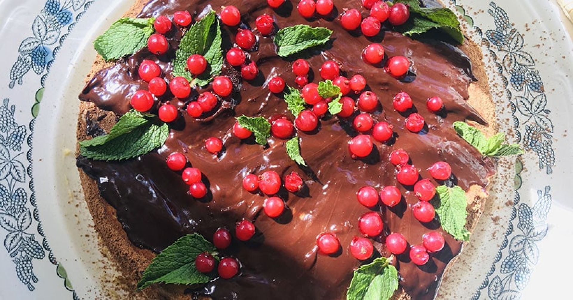 Оставшуюся часть шоколада растопите с кусочком сливочного масла и залейте верх пирога. Украсить можно любыми ягодами — клюква или брусника лёгкой кислинкой оттенят сладость пирога.